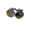 Unas colleras THOMAS J. FIEDLER en caja. Estas colleras de acero inoxidable presentan una cara con diseño en metal y su respectiva incrustación. Este par moderno se completa con un cierre de clip.