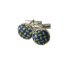 Unas colleras THOMAS J. FIEDLER en caja. Estas colleras de acero inoxidable presentan una cara con diseño en metal y su respectiva incrustación. Este par moderno se completa con un cierre de clip.