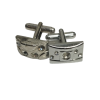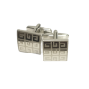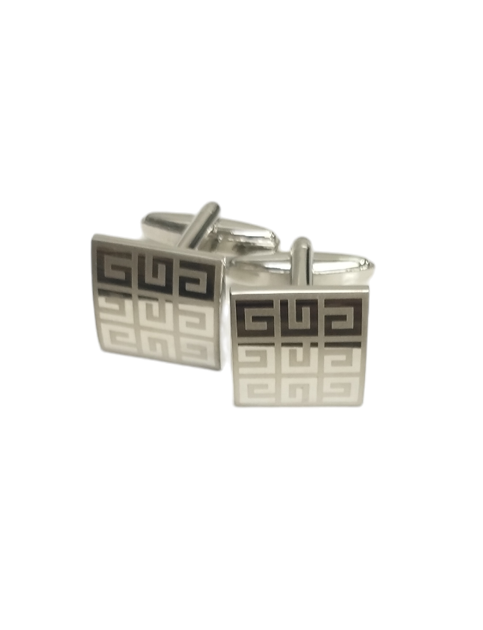 Unas colleras THOMAS J. FIEDLER en caja. Estas colleras de acero inoxidable presentan una cara con diseño en metal y su respectiva incrustación. Este par moderno se completa con un cierre de clip.