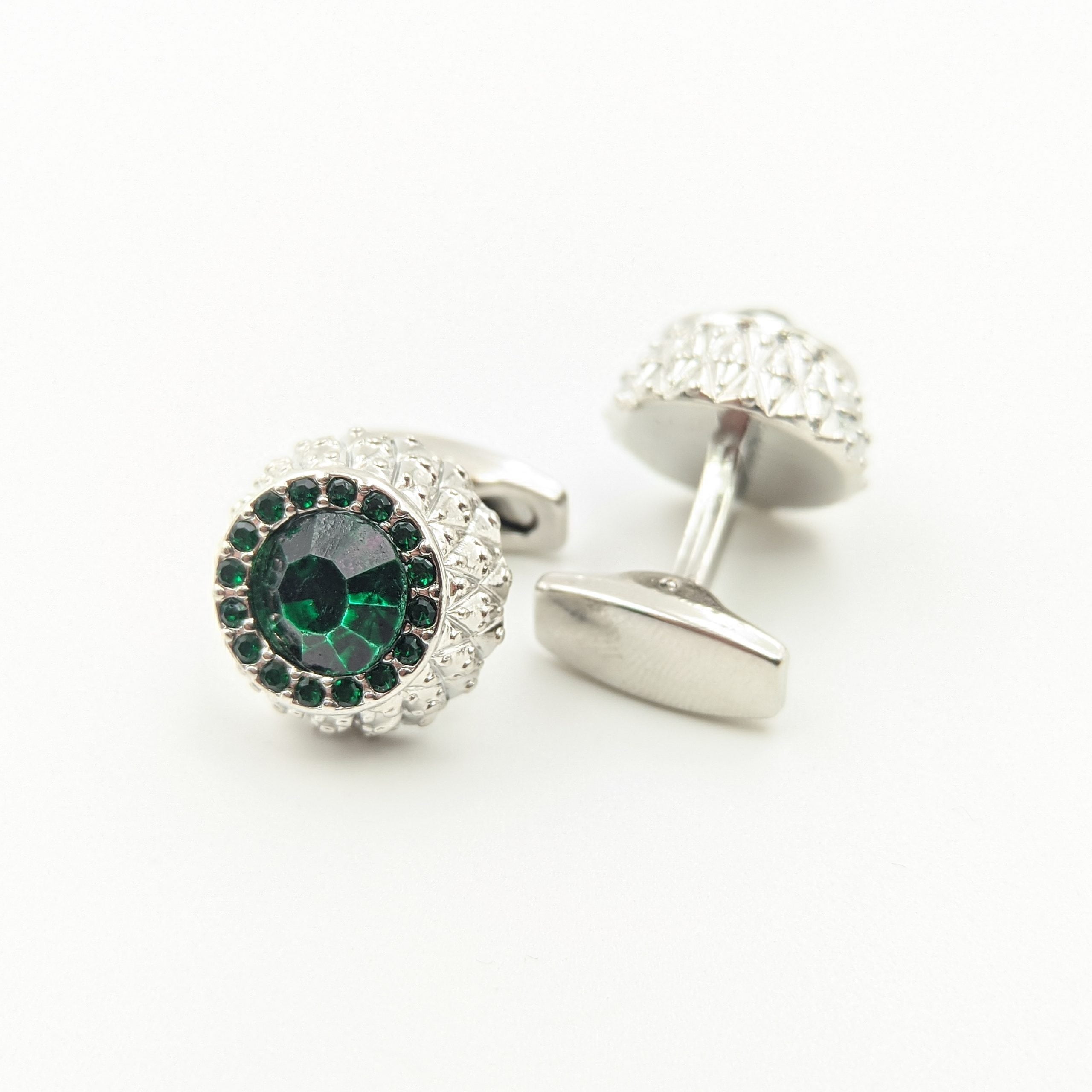 Unas colleras THOMAS J. FIEDLER en caja. Estas colleras de acero inoxidable presentan una cara con diseño en metal y su respectiva incrustación. Este par moderno se completa con un cierre de clip.