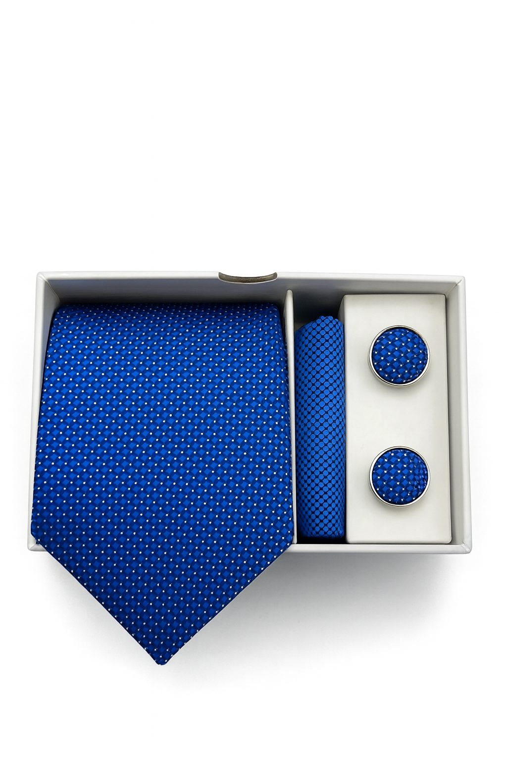 Set de corbata de tres piezas compuesto por corbata elaborada en 80% seda y 20% poliéster.