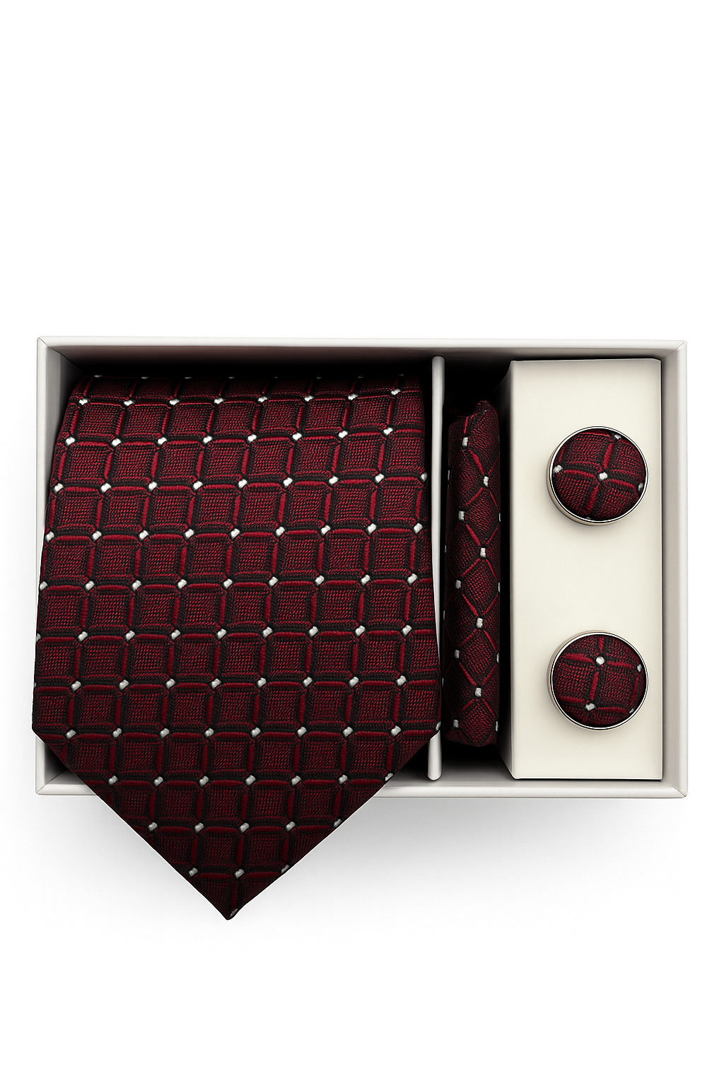 Set de corbata de tres piezas compuesto por corbata elaborada en 80% seda y 20% poliéster.