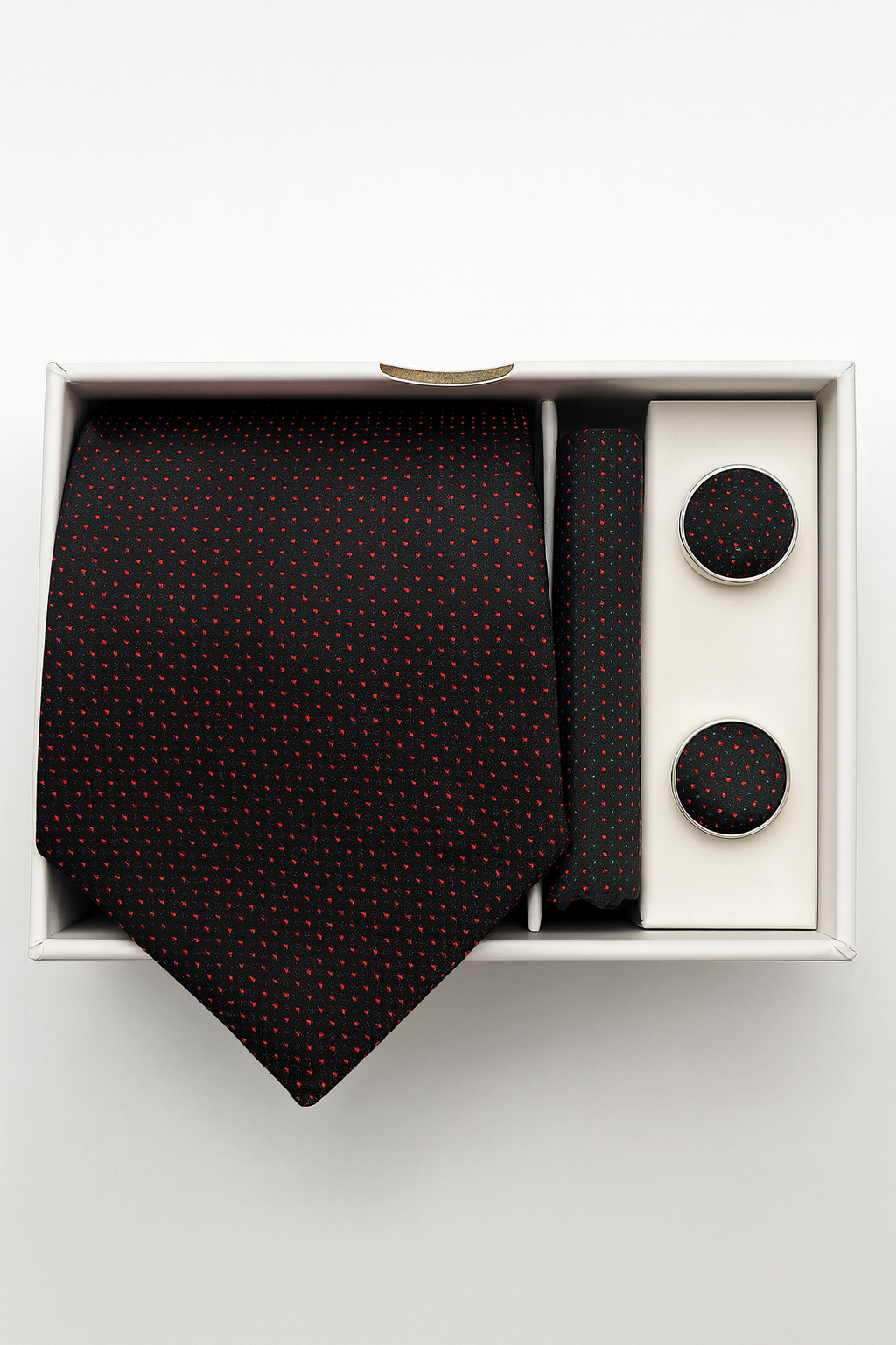 Set de corbata de tres piezas compuesto por corbata elaborada en 80% seda y 20% poliéster.