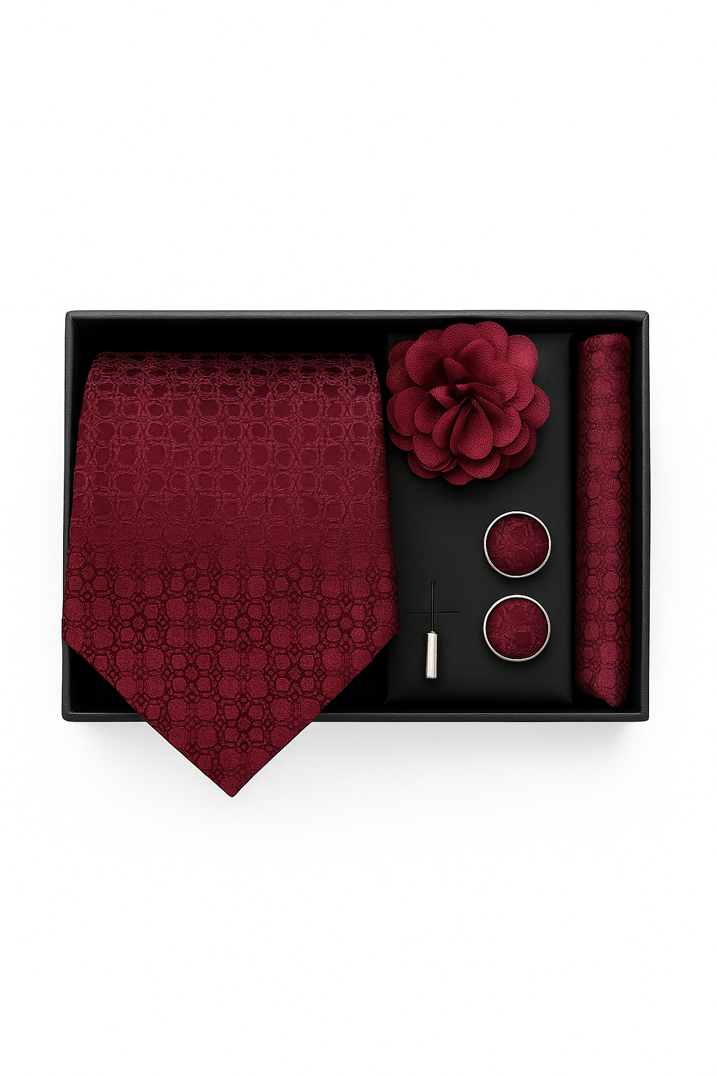 Set de corbata de cuatro piezas compuesto por corbata elaborada en 80% seda y 20% poliéster