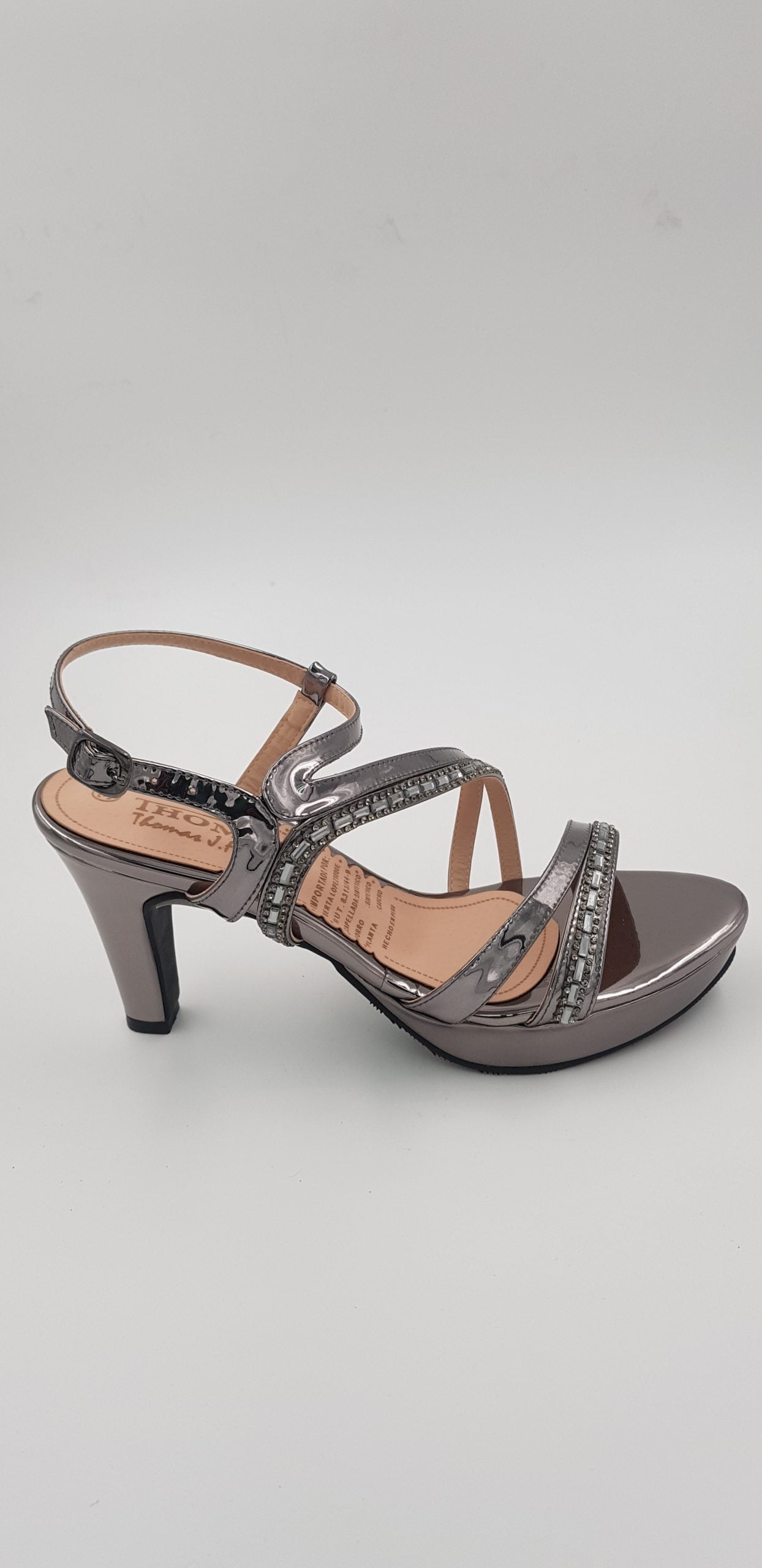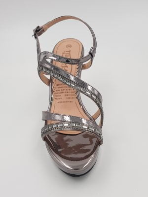 Zapato de fiesta de taco alto, para mujer, de color gris plomo y detalles en pedrería de fantasía